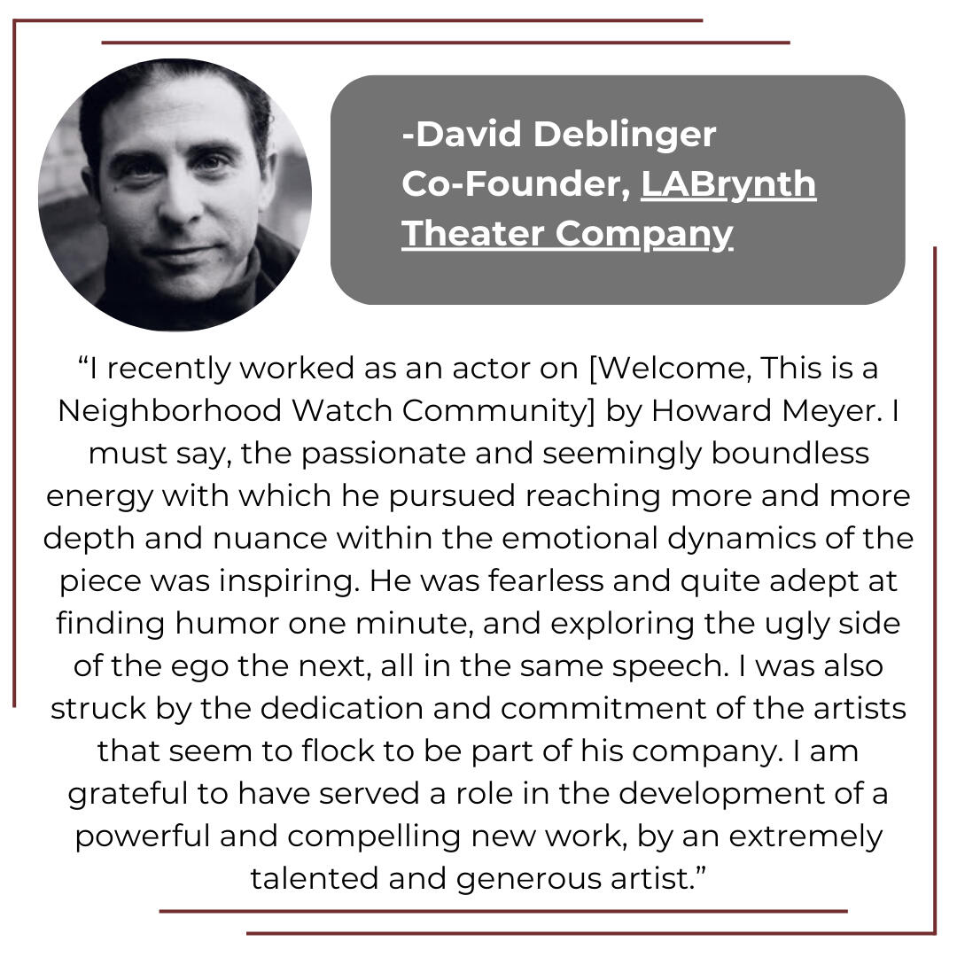 | WELCOME, THIS IS A NEIGHBORHOOD WATCH COMMUNITY | Axial Theatre, November 2010, directed by Josh Hecht | Naked Angels Tuesdays at 9, NYC Play Development Collective, Axial Theatre Play Reading Series | The Barrow Group, November 2009; Hudson Valley Writers Center, September 2009, Pacific Resident Theatre, January 2012 |